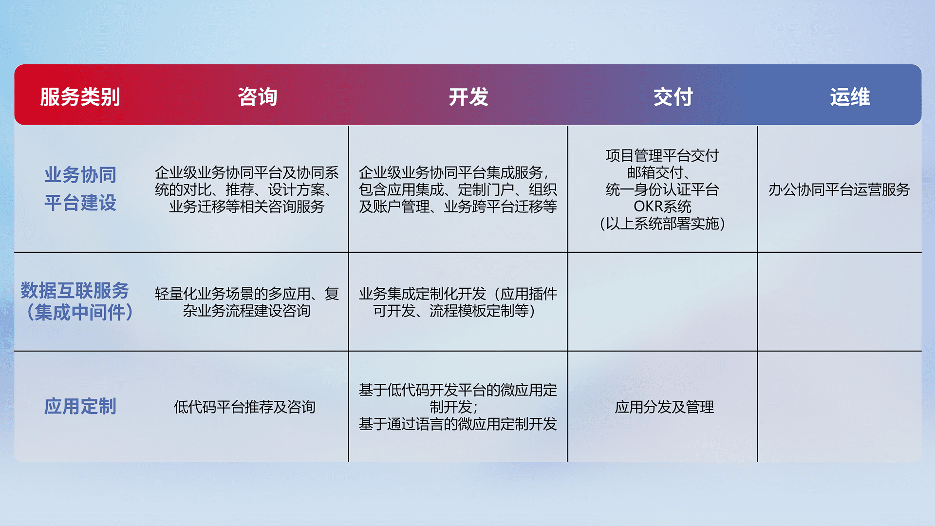 针对钉钉、、、企微、、IDaas等平台级产品提供产品的规划、、方案、、、、交付、、定制化开发等服务,,实现如统一协同办公、、、、智能客户服务、、混合会议管理、、、智能数据查询、、、、等业务场景,,,实现数字化转型。。